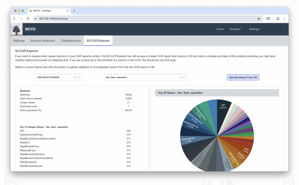 What about the other 90+ columns? The BOYD settings page includes a search utility called S3 CUR Explorer that provides a statistical summary of a CUR column’s contents using the raw data in S3. Select a bill period and column and you can quickly assess the top values in use and frequency.