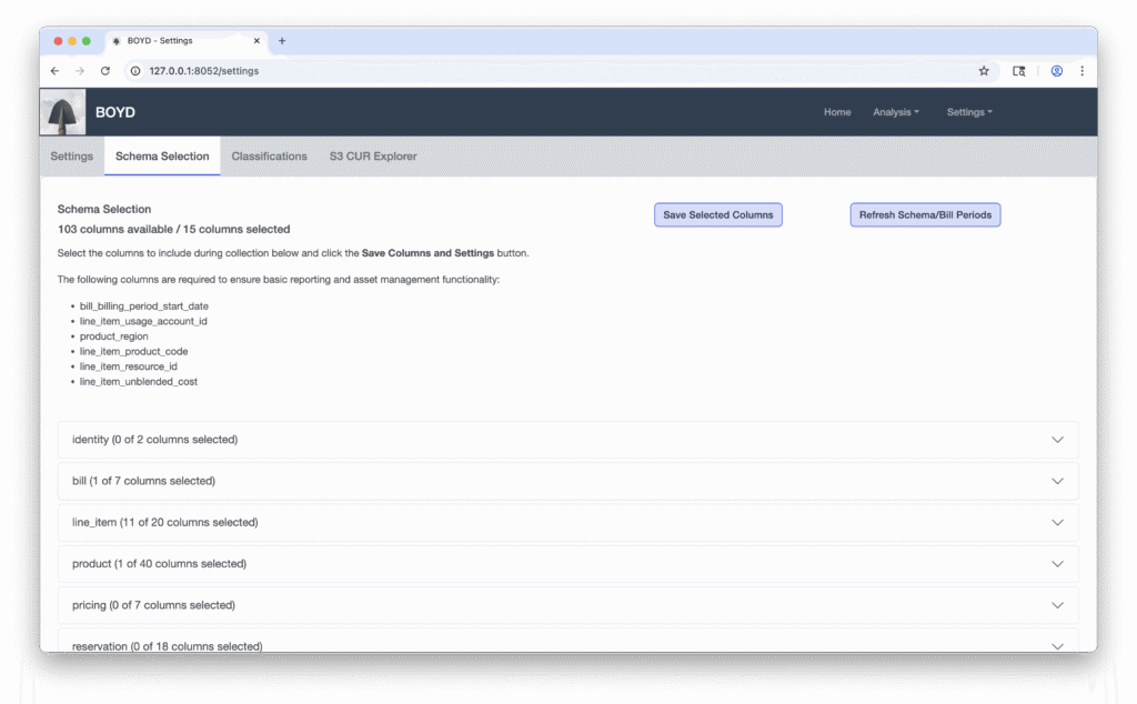 Don’t stress over column selection, but instead feel free to experiment. Because of the unpredictable nature of some CUR fields, BOYD is built to be very forgiving. For example, if you have collected data for several months then add a new selected column for collection (such as when you add a new cost allocation tag) if you include the column in filters or group by values, the value for data where the column did not exist will be “column not available”. This also means you can use BOYD to collect a column for one bill period, analyze results and disable the column from future collections when no longer required.